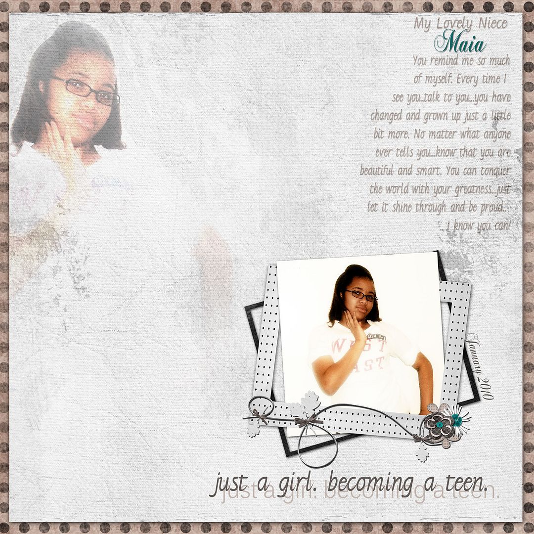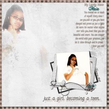 This first was done for a speed scrap at GDS. Photo is of my niece Maia, 10; she had just gotten her hair done that day and of course, I asked her for photo time...